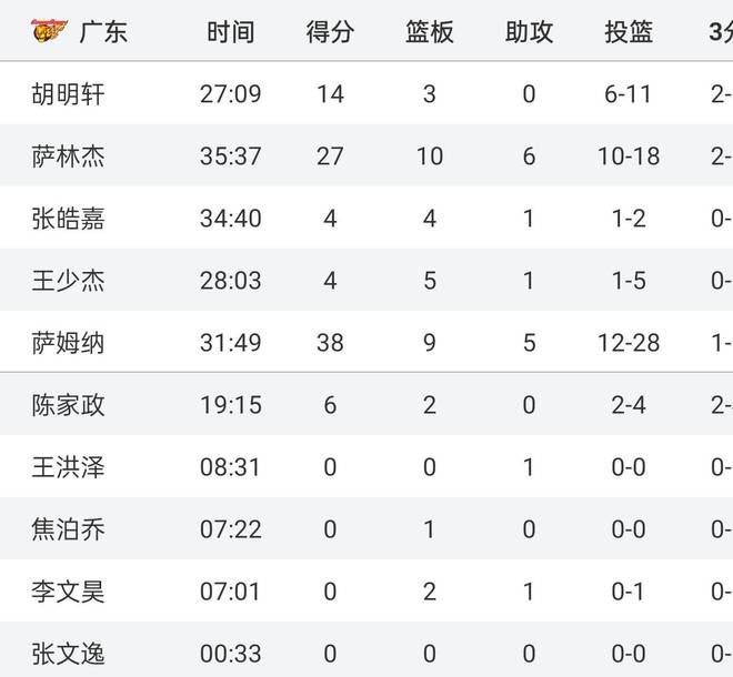其实上场31分输北京,就能发现,广东男篮本土球员实力有限,在徐杰受伤后,球队找不到合格的组织后卫,全队出了萨姆纳和萨林杰外,无一人得分上双。这场比赛打北控也是,全队上场10人,除了2大外援和胡明轩外,无一人得分上双,得分最高的是陈家政的6分。