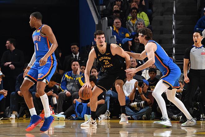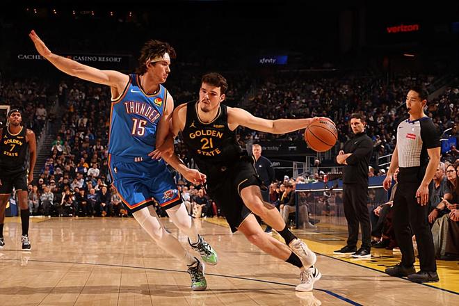 本场比赛中,勇士的先发中锋昆滕-波斯特(Quinten Post)的表现令人大跌眼镜。波斯特全场出场22分47秒,投篮10中4,三分线外6中1,罚球2中2,得到了11分3篮板2助攻1抢断的数据,还有1次失误和5次犯规,正负值为-21。波斯特在进攻端效率不佳,还是没有办法发挥出自己在外线投篮方面的能力,他也缺乏其他稳定的进攻手段,他在进攻端的效果当然是很不理想的。除此之外,波斯特在防守端的表现同样是无法令人感到满意的,他在篮板保护方面的问题非常明显,他在内线防守方面也显得力不从心。至少在本场比赛中,波斯特在攻防两端的表现都是灾难级别的,完全没有达到大家的预期,可以说是被雷霆各种打爆了。